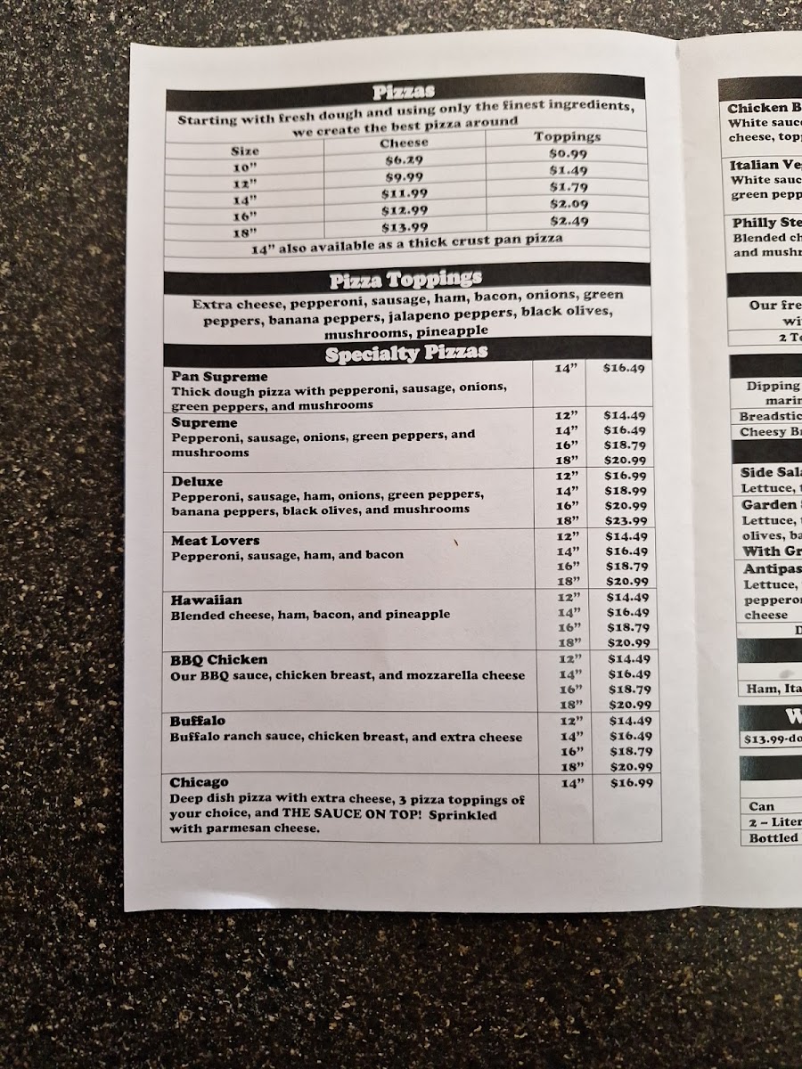 Introducing the menu at Jezepe's Pizza & Subs, located in the heart of Cochranton, PA, is a delightful journey for pizza lovers and sandwich enthusiasts alike. Their robust pizza selection features a classic Cheese Pizza, customizable with an array of fresh toppings like pepperoni, sausage, and even pineapple for that tropical twist. The standout is the Pan Supreme, a thick dough pizza loaded with pepperoni, sausage, onions, and mushrooms—a true crowd-pleaser.